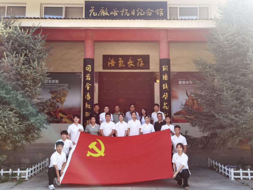 团队师生在花厂峪抗日纪念馆与党旗合影