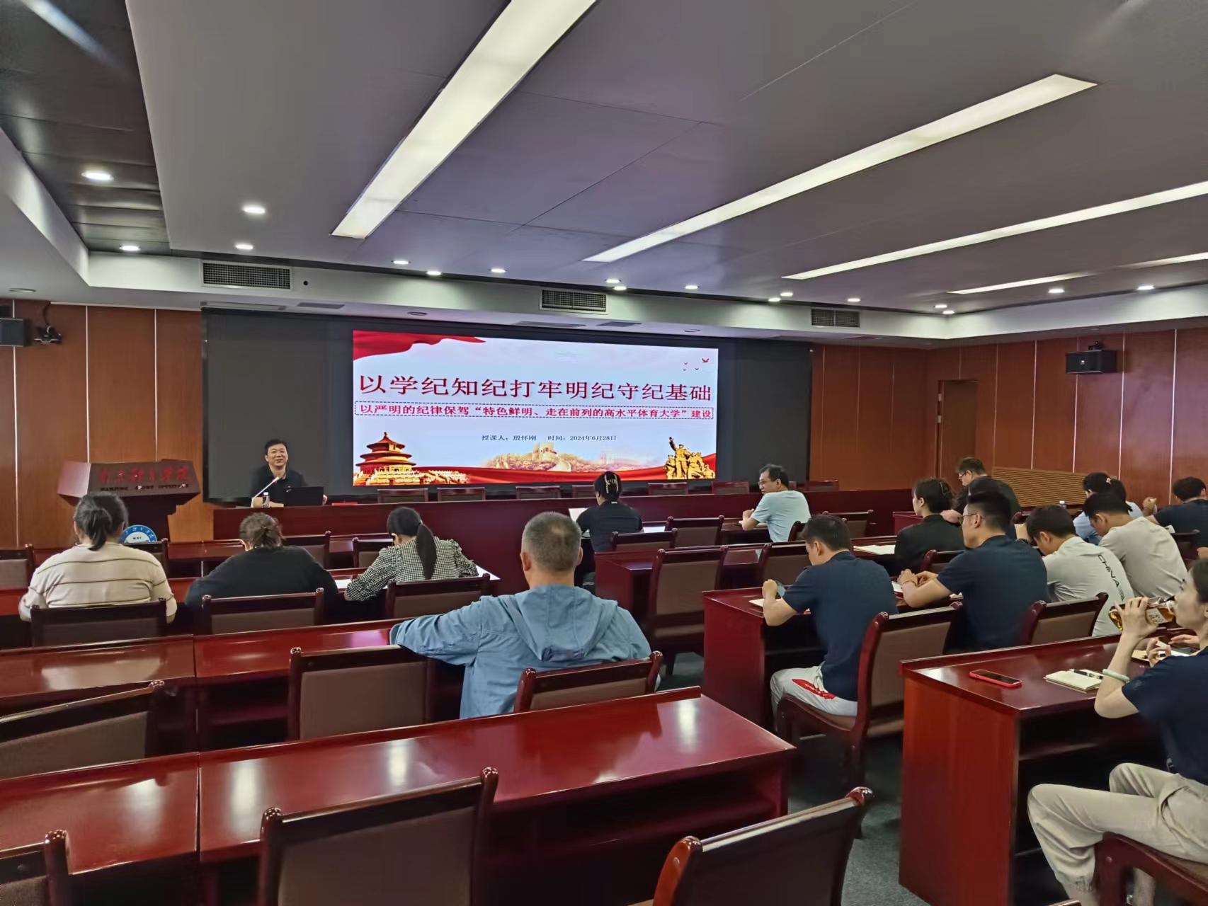 殷怀刚部长以《以学纪知纪打牢明纪守纪基础——以严明的纪律保驾“特色鲜明、走在前列的高水平体育大学”建设》为题,分“强根基、认识党纪学习教育重大意义,深研读、推动《条例》学习入脑入心,重行动、保持政治清醒强化履职担当”三个章节为党员授课。课程中,既讲授了党的纪律建设在党的发展历程、新时代现实发展需要、高校高质量发展中的极端重要作用,又阐释了“六项纪律”的主旨要义和规定要求,并分析典型案例达到举一明三的警示效果。