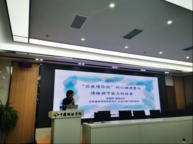 受新冠肺炎疫情影响,网球学院运动员已坚持近4个月的封闭训练。为调整队员的心理状态,消除心理上产生的疲劳,并进一步提升训练质量,激发运动员训练活力,5月21日上午,网球学院邀请了江苏省体科所运动心理学专家毕晓婷博士来院做了题为“后疫情阶段的心理调整与情绪调节能力的培养”的专题讲座。网球学院全体教练员、运动员及部分管理干部聆听了讲座。
