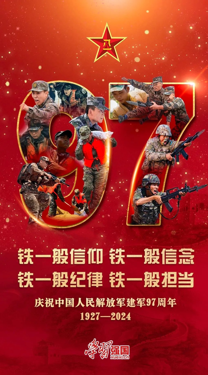 97年来,正是在党的坚强领导下,人民军队从无到有、由弱到强,理想信念的火种代代赓续,红色传统的基因一脉相传,始终以党的旗帜为旗帜、以党的方向为方向、以党的意志为意志,坚决做到绝对忠诚、绝对纯洁、绝对可靠。