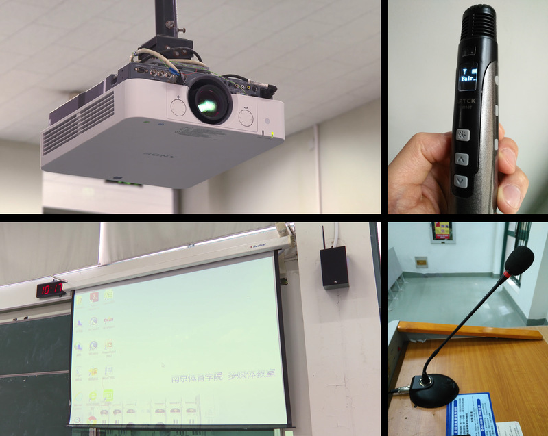 36365本部教学实验楼1号楼、2号楼、仙林教学楼皆为多媒体教室。其中多媒体设备包括:讲台里的电脑、中央控制器(中控)、音频功率放大器(功放)、悬挂的环绕音箱、教学督导摄像机。在阶梯教室、大教室里还配备了投影仪、投影幕布、桌面鹅颈式话筒、翻页笔(兼具麦克风功能)。