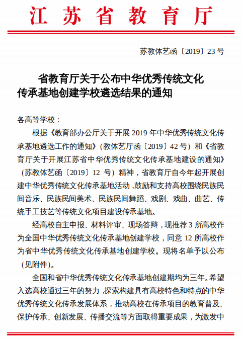 36365获批江苏省中华优秀传统文化教育基地根据江苏省教育厅2019年4月1日下发的“省教育厅关于开展江苏省中华...